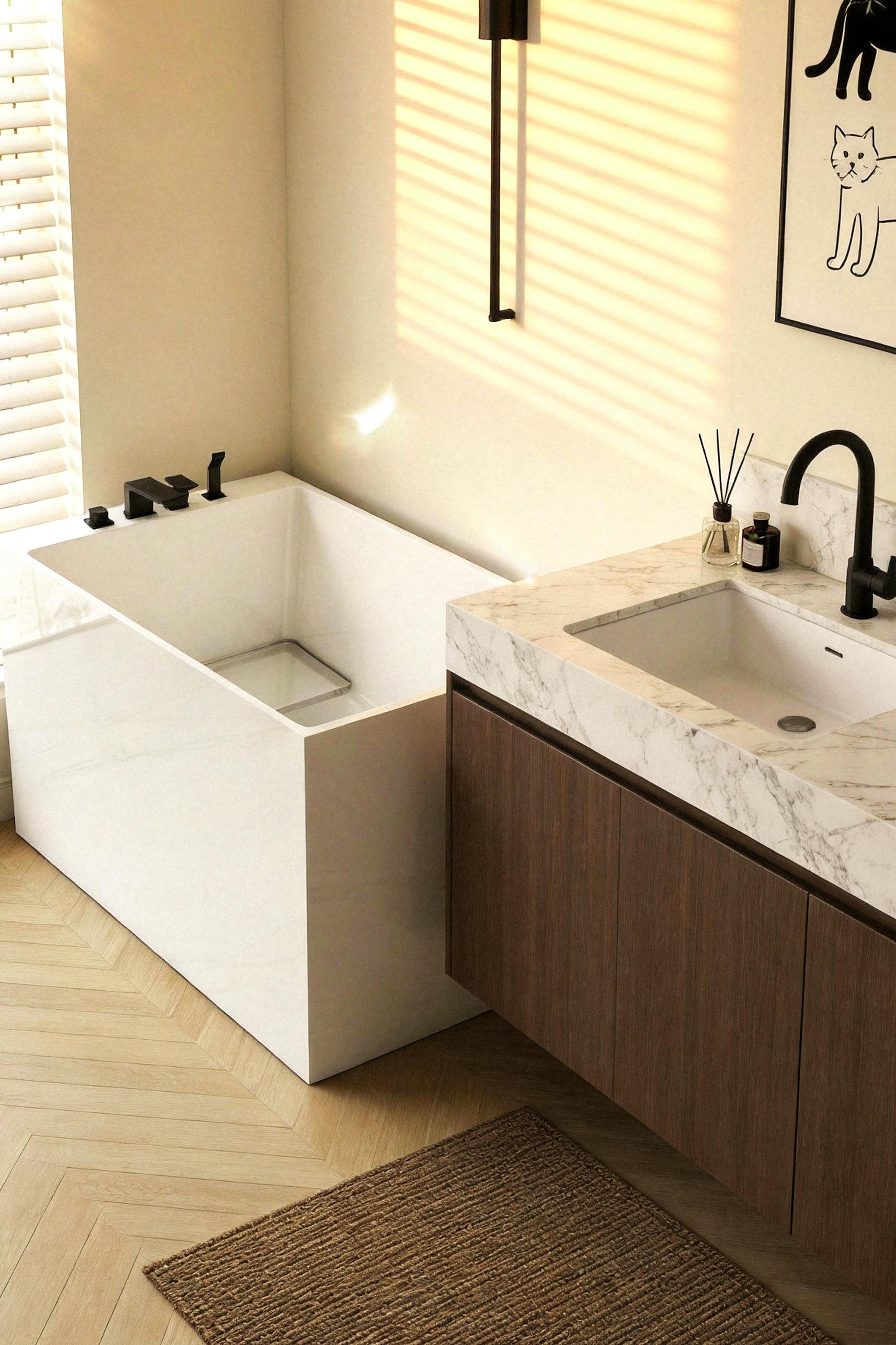 The MonBlari® XA-156 Rectangular Bath is designed for modern homes that value clean geometry, practical soaking depth, and premium craftsmanship. Its sharp architectural silhouette and deep rectangular basin make it ideal for compact bathrooms that still demand a luxurious bathing experience.